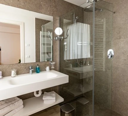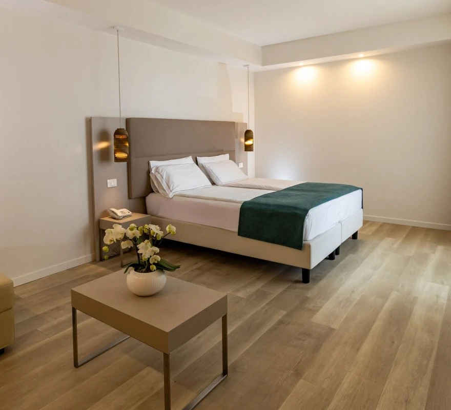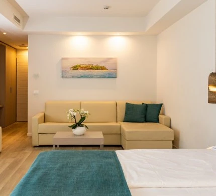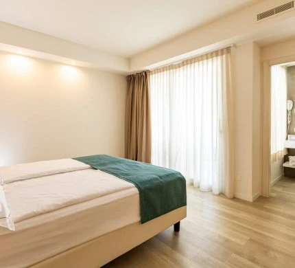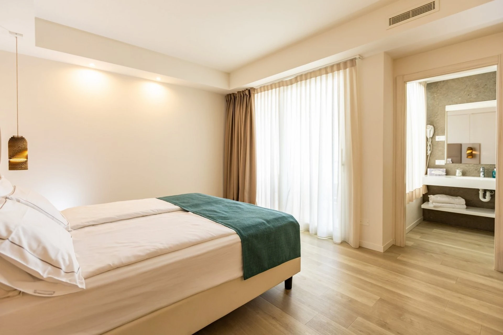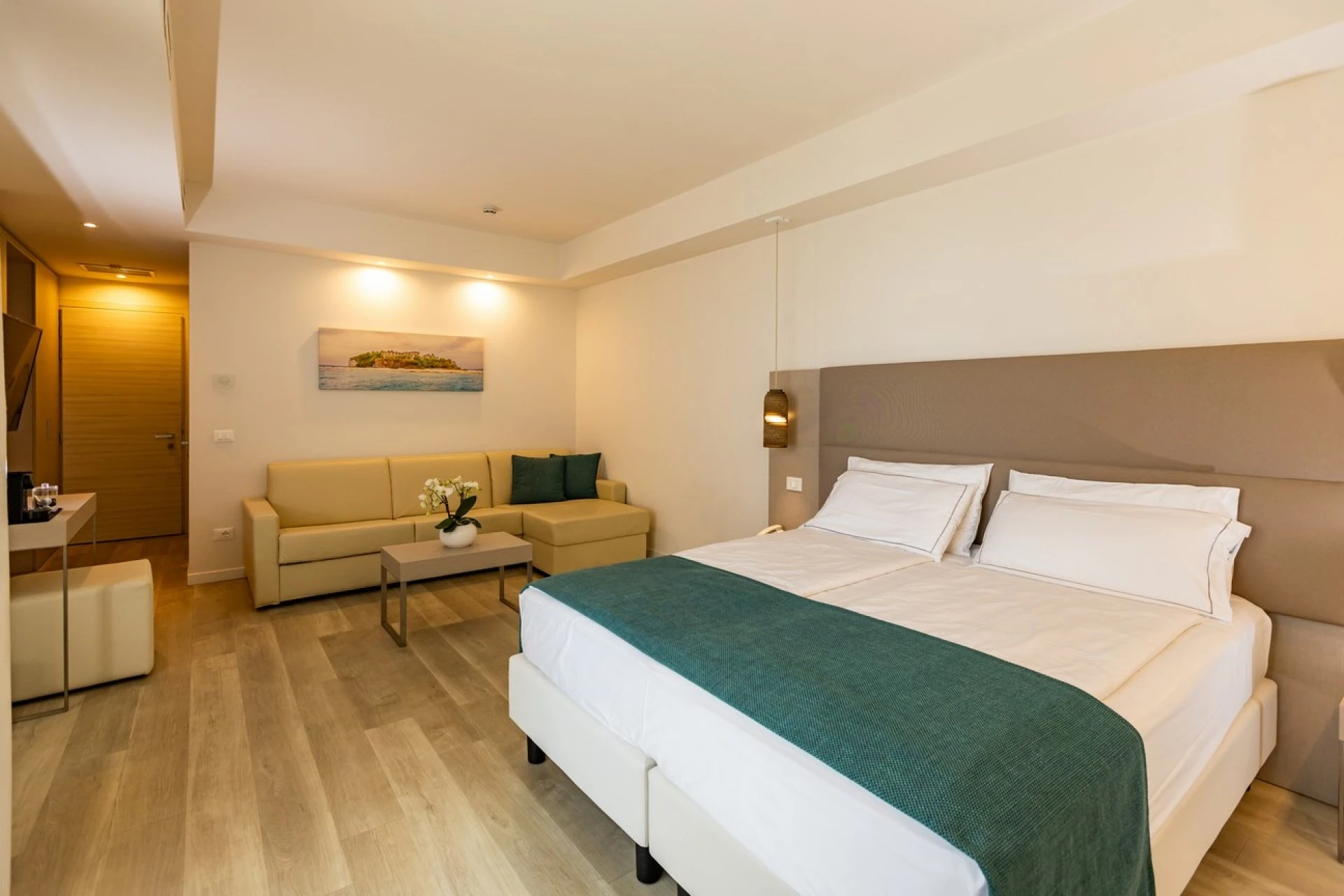 Elegante, geräumige und gemütliche Suite mit einem Doppelbett und einem Schlafsofa. Das moderne Badezimmer verfügt über natürliches Licht und die Dusche und das Waschbecken sind von der Toilette und dem Bidet getrennt. Unsere Junior-Suiten sind ideal für alle, die viel Platz in einer hellen, freundlichen Umgebung suchen, die eine Atmosphäre tiefer Ruhe schafft. Eine mit Sesseln und einem Couchtisch ausgestattete Terrasse mit wunderschönem Seeblick vervollständigt das Zimmer.