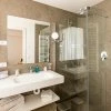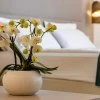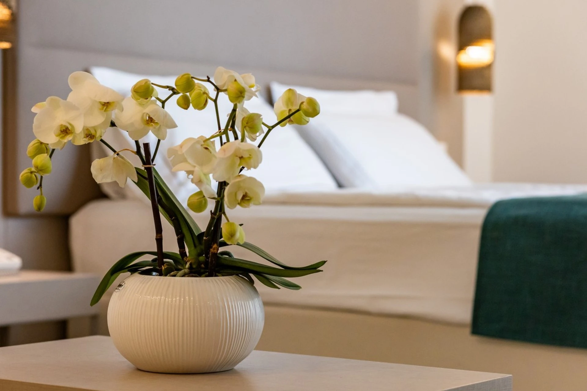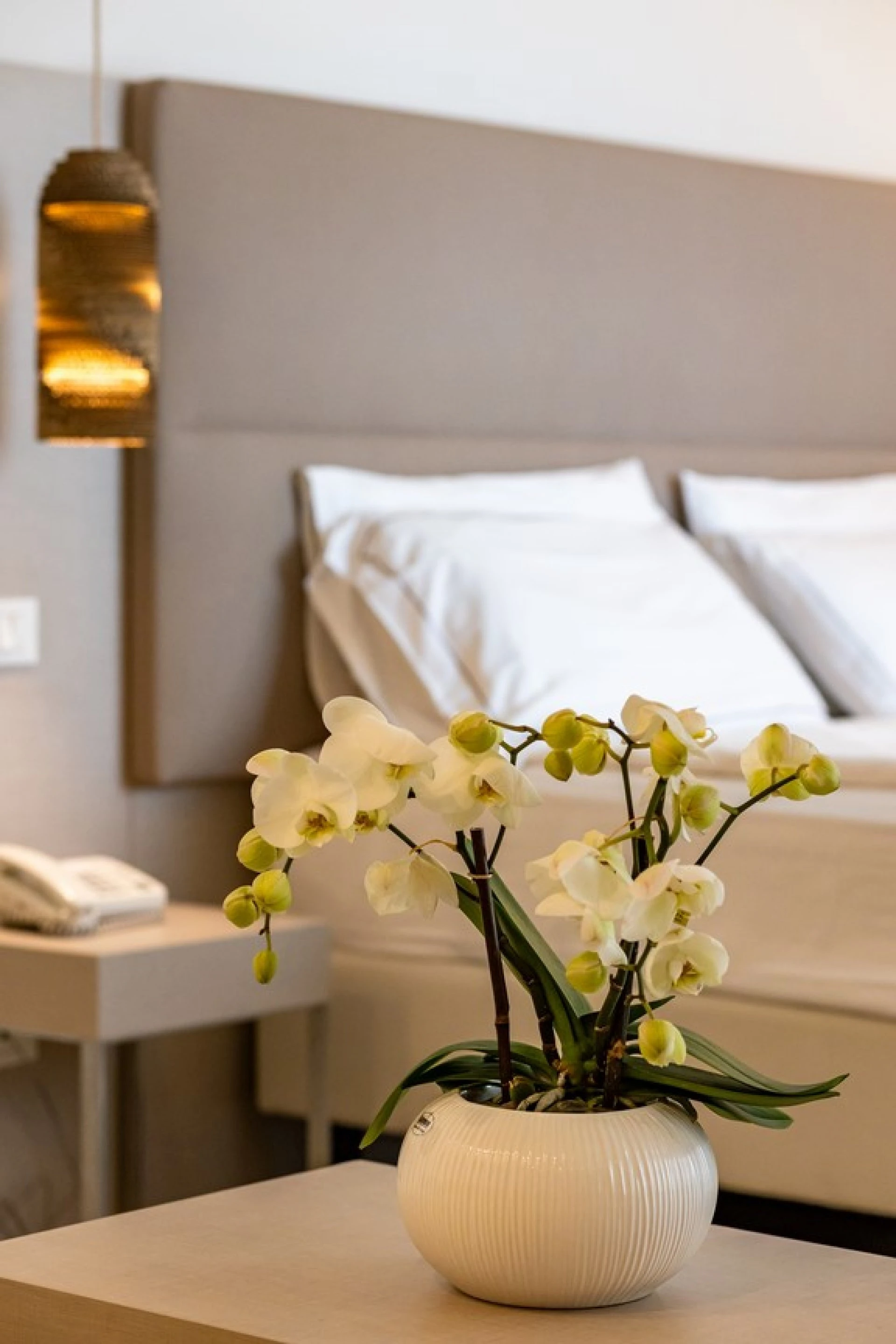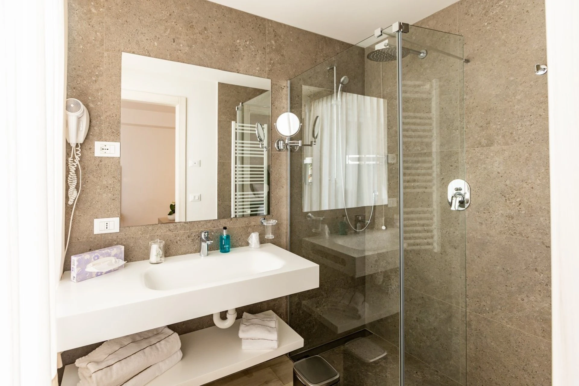 Elegante, geräumige und gemütliche Suite mit einem Doppelbett und einem Schlafsofa. Das moderne Badezimmer verfügt über natürliches Licht und die Dusche und das Waschbecken sind von der Toilette und dem Bidet getrennt. Unsere Junior-Suiten sind ideal für alle, die viel Platz in einer hellen, freundlichen Umgebung suchen, die eine Atmosphäre tiefer Ruhe schafft. Eine mit Sesseln und einem Couchtisch ausgestattete Terrasse mit wunderschönem Seeblick vervollständigt das Zimmer.