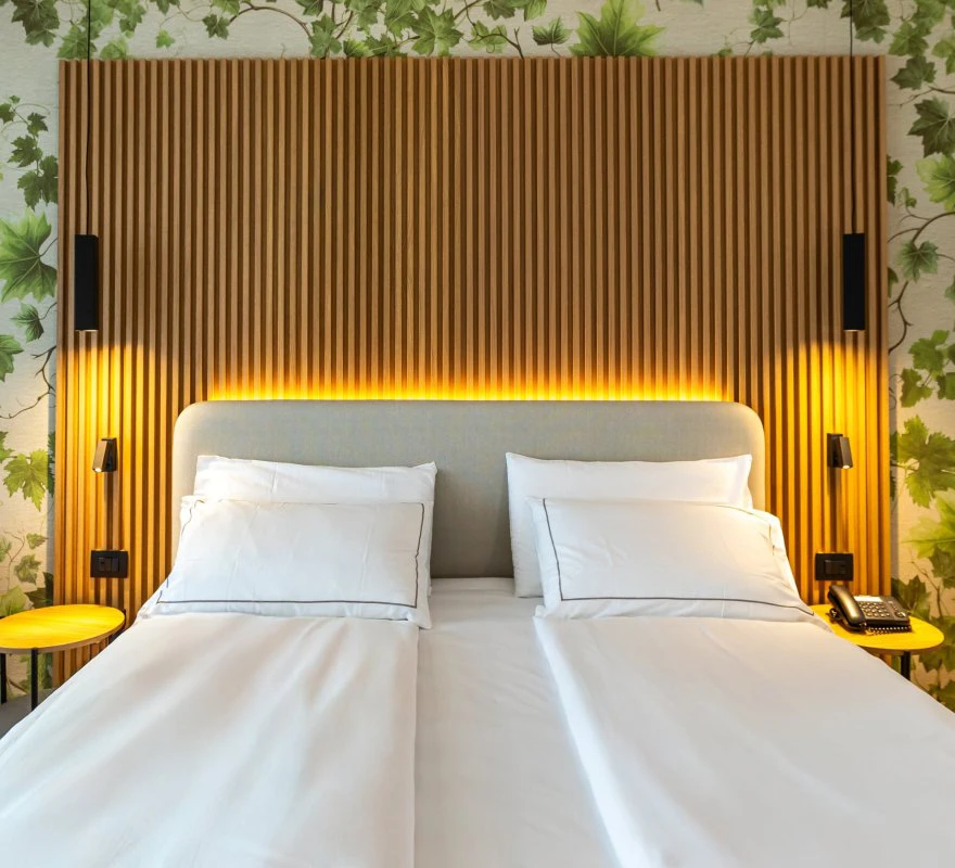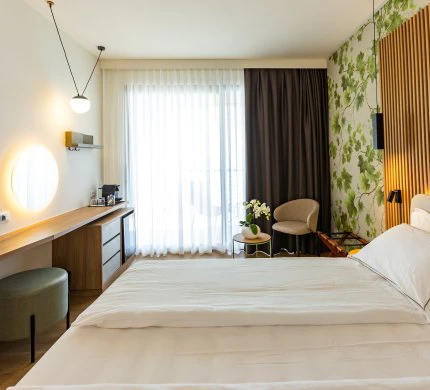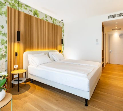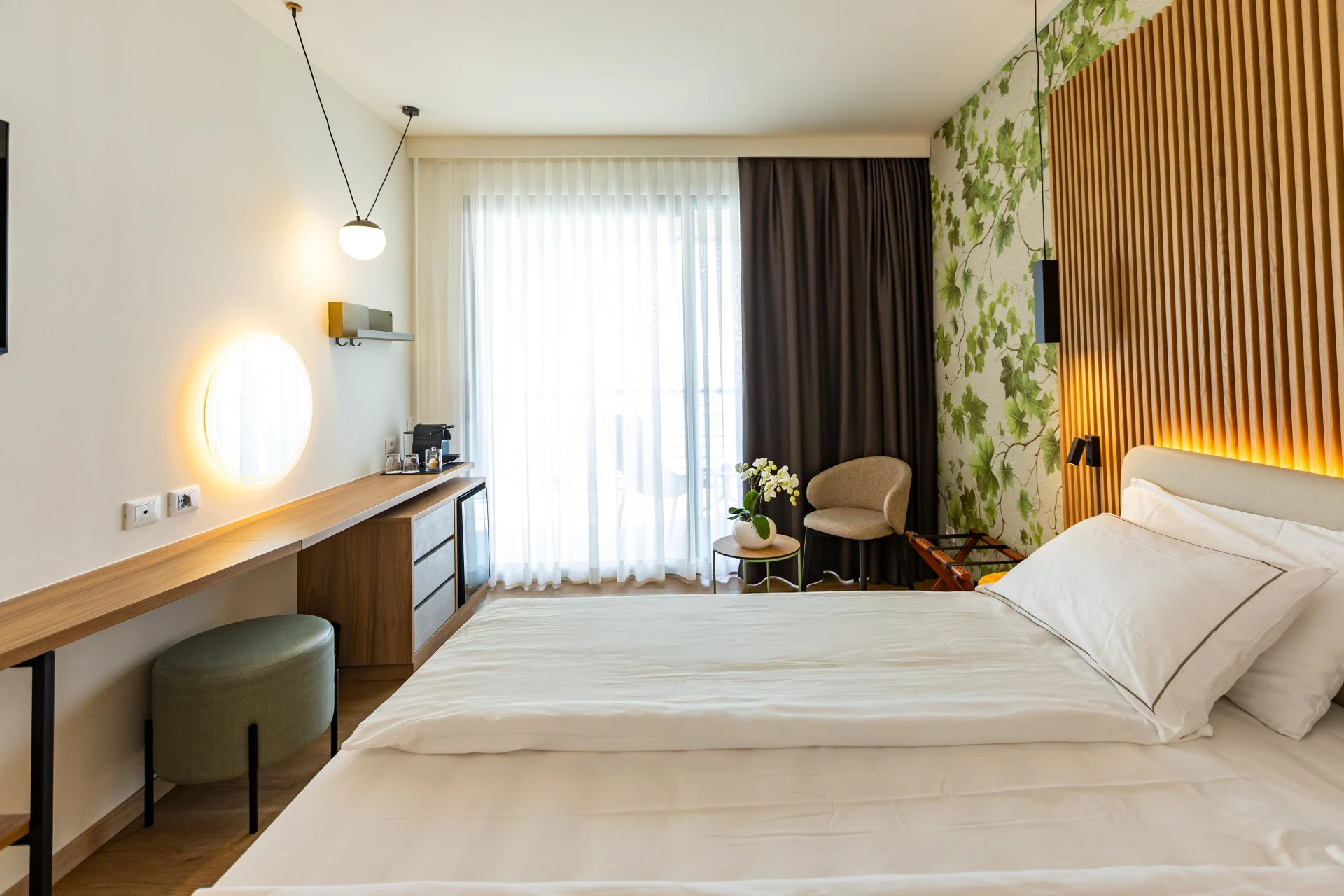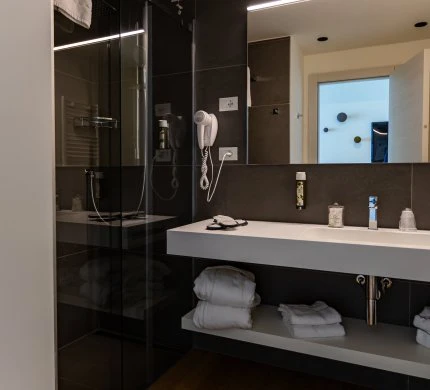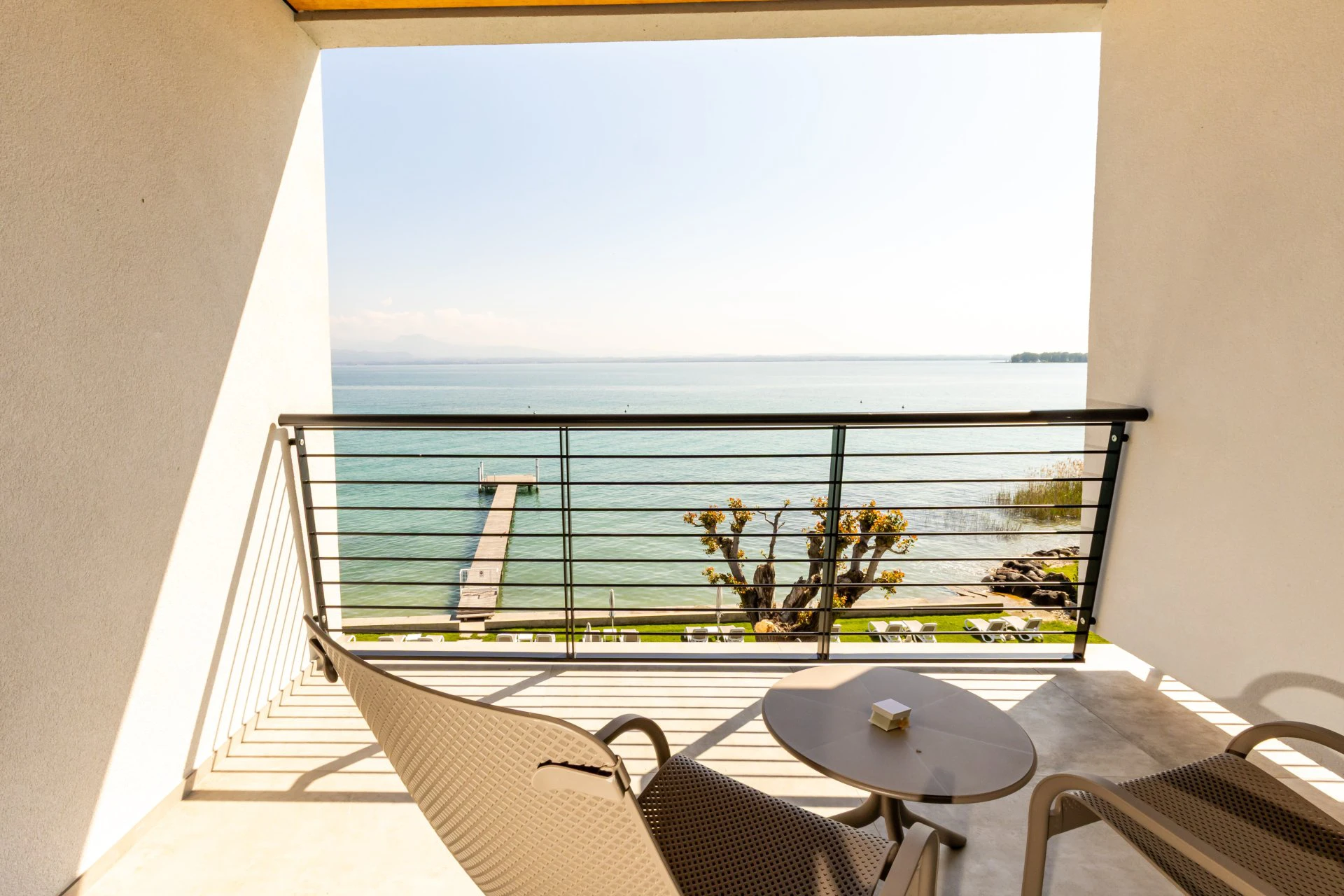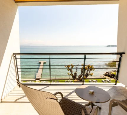 Chambre confortable avec lit double et salle de bain moderne avec douche. Nos chambres Deluxe sont le refuge idéal pour ceux qui recherchent une atmosphère de détente et d'harmonie grâce à la chaleur émanant du bois et au choix minutieux des couleurs. Une grande terrasse équipée de chaises longues et d'une petite table avec une vue frontale sur le lac, idéale pour admirer les levers de soleil magiques du lac de Garde ou les reflets sur l'eau au coucher du soleil.